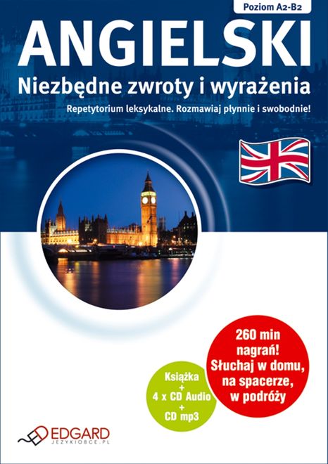 Angielski Niezbędne zwroty i wyrażenia to doskonałe repetytorium leksykalne dla osób początkujących i średnio zaawansowanych. Pakiet jest unikalnym zestawieniem zwrotów konwersacyjnych niezbędnych do swobodnego porozumiewania się po angielsku. Niezbędne zwroty i wyrażenia dzięki rozbudowanym przykładom i licznym ćwiczeniom przygotowują do matury oraz egzaminu FCE. Pakiet polecamy także wszystkim, którzy chcą poszerzyć praktyczną znajomość języka angielskiego przed wyjazdem za granicę do pracy i w celach turystycznych. Książka uczy 1300 zwrotów i wyrażeń angielskich. Wszystkie zwroty zilustrowano zdaniem lub krótkim dialogiem ukazującym ich użycie w kontekście. W podręczniku znajdują się pełne teksty nagrań, tłumaczenia, słowniczek oraz testy i ćwiczenia. Na płytach (4 x CD Audio) zamieszczono ponad 260 minut nagrań native speakerów. Tematyka obejmuje 35 najważniejszych sytuacji komunikacyjnych, m.in. Nawiązywanie kontaktów, wyrażanie emocji i opinii, negocjowanie, prowadzenie rozmów telefonicznych, a także zagadnienia poświęcone mediom, finansom i ekonomii, nauce i technice. Piąta płyta zawiera wszystkie nagrania w formacie mp3 do słuchania w domu, w samochodzie, w drodze do pracy lub szkoły oraz w podróży. Angielski Niezbędne zwroty i wyrażenia to: - 1300 zwrotów i wyrażeń niezbędnych do swobodnego porozumiewania się, - minidialogi i gotowe zdania uczące płynnej konwersacji, - ponad 260 minut nagrań po polsku i angielsku – tylko native speakerzy, - słówka, kolokacje i wyrażenia idiomatyczne dla średnio zaawansowanych, - książka (176 stron): pełny zapis nagrań, ćwiczenia, testy, tłumaczenia słówek, zdań i dialogów, podręczny słowniczek.