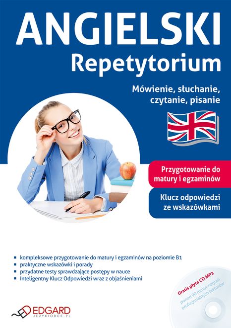 ANGIELSKI Repetytorium Mówienie, słuchanie, czytanie, pisanie to: - kompleksowe przygotowanie do matury i egzaminów na poziomie średnio zaawansowanym - omówienie wszystkich części egzaminów, - praktyczne porady i wskazówki oraz przydatne zwroty - Inteligentny Klucz Odpowiedzi wraz z objaśnieniami - CD MP3 z najciekawszymi nagraniami – GRATIS! ANGIELSKI Repetytorium Mówienie, słuchanie, czytanie, pisanie to książka składająca się z zadań najczęściej spotykanych na egzaminach z języka angielskiego na poziomie średnio zaawansowanym. Podręcznik uzupełnia, weryfikuje i utrwala wiadomości nabyte w szkole czy na kursach językowych. Książka polecana jest szczególnie osobom przygotowującym się do egzaminów na poziomie B1. Podręcznik podzielony jest na rozdziały obejmujące część pisemną i część ustną testów. Ćwiczenia praktyczne poprzedzone są omówieniem najczęściej pojawiających się zadań oraz praktycznymi wskazówkami, które pomogą rzetelnie przygotować się do egzaminów. Książka zawiera część poświęconą znajomości środków językowych, obowiązującą na egzaminie maturalnym od 2015 roku. W specjalnie opracowanym Inteligentnym Kluczu Odpowiedzi szczegółowo omówiono prawidłowe rozwiązania. Dodatkowo książka zawiera pełną transkrypcję nagrań do zadań na rozumienie ze słuchu. Płyta CD MP3 obejmuje ponad 90 minut nagrań wykonanych przez profesjonalnych lektorów. Pozwala oswoić się z różnymi akcentami, które można usłyszeć podczas egzaminu, oraz skutecznie przygotować się do części ustnej.