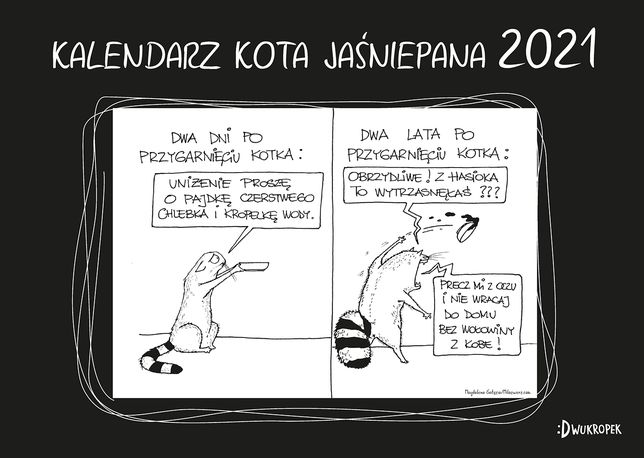 Kalendarz ścienny Kota Jaśniepana z dwunastoma rysunkami komiksowymi pochodzącymi z niezwykle popularnego bloga "Miłozwierz". Dla wszystkich fanów uroczego, ale rozkapryszonego kota Jaśniepana.