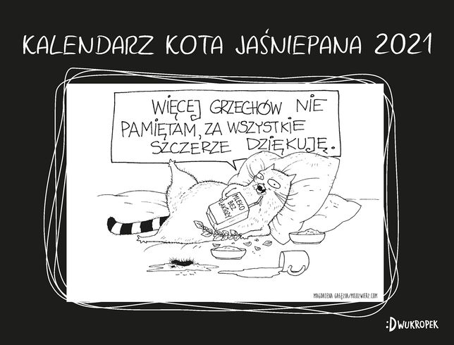 Kalendarz biurkowy stojący poziomy na spirali z kalendarium tygodniowym. Każdy tydzień został opatrzony rysunkiem komiksowym pochodzącym z niezwykle popularnego bloga Miłozwierz. Dla wszystkich fanów uroczego, ale rozkapryszonego kota Jaśniepana.