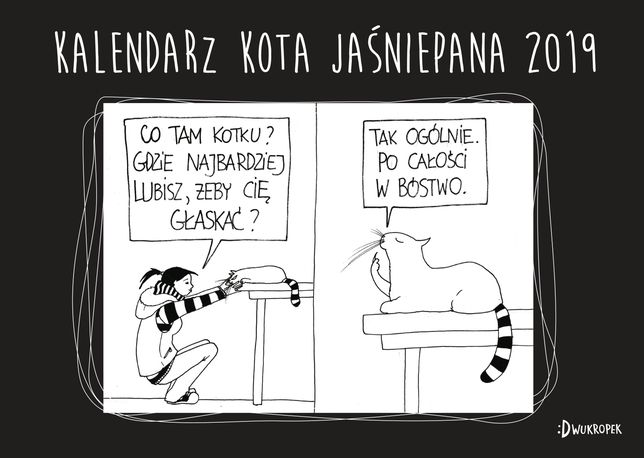 Kalendarz ścienny z 12 rysunkami komiksowymi pochodzącymi z niezwykle popularnego bloga "Miłozwierz" i miesięcznym kalendarium. Gratka dla wszystkich wielbicieli uroczego, ale rozkapryszonego kota Jaśniepana.