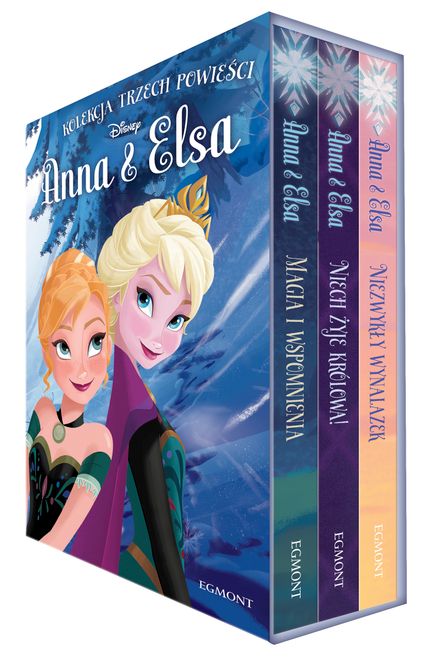 Pudełko prezentowe zawiera 3 powieści z serii Anna i Elsa: "Niezwykły wynalazek", "Magia wspomnienia", "Niech żyje królowa!".