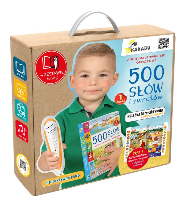 Zestaw zawiera: książkę 500 słów i zwrotów. Angielski słowniczek obrazkowy cz. 1, pióro Kakadu w trwałym etui i planszę z wyszukiwanką W parku rozrywki, dzięki której dzieci sprawdzą swoją spostrzegawczość, poznają nazwy zwierząt i usłyszą odgłosy, jakie one wydają. Całość została zamknięta w pudełku z rączką.