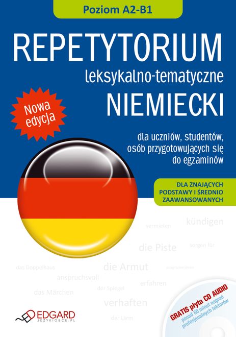 NIEMIECKI Repetytorium leksykalno-tematyczne to: - nauka 3000 słów, wyrażeń i kolokacji, - 42 zagadnienia uporządkowane w 14 rozdziałach, - kilkadziesiąt interesujących tekstów pokazujących użycie słów w praktyce, - ponad 250 różnorodnych ćwiczeń z kluczem odpowiedzi, - współczesne, aktualne słownictwo, potoczne zwroty i wyrażenia, - CD AUDIO z najciekawszymi nagraniami – GRATIS! Nowoczesne Repetytorium leksykalno-tematyczne umożliwia naukę ponad 3000 słów, wyrażeń i kolokacji na poziomie średnio zaawansowanym (A2-B1 wg klasyfikacji Rady Europy), a także trening wymowy. Zestaw (książka + płyta CD AUDIO) adresowany jest do uczniów, samouków oraz osób, które chcą poszerzyć zasób niemieckiego słownictwa oraz skutecznie utrwalić znajomość zwrotów przydatnych w pracy i w życiu codziennym. Opracowany został również z myślą o uczniach szkół średnich, maturzystach i studentach przygotowujących się do egzaminów na poziomach A2-B1. Podręcznik obejmuje kilkadziesiąt zagadnień usystematyzowanych w 14 rozdziałach tematycznych. Każdy rozdział zawiera ciekawe teksty, podzielone tematycznie listy słownictwa, jak również ćwiczenia rozwijające wszystkie kompetencje językowe - słuchanie, czytanie, pisanie oraz mówienie. W książce znajdują się dodatkowo krótkie, praktyczne wskazówki dotyczące strategii uczenia się i rozwiązywania zadań egzaminacyjnych. Płyta CD AUDIO jest doskonałym uzupełnieniem nauki z podręcznikiem. Zawiera ponad 60 min wysokiej jakości nagrań w wykonaniu native speakerów. Jest szczególnie pomocna w nauce prawidłowej wymowy oraz w ćwiczeniu umiejętności rozumienia ze słuchu.