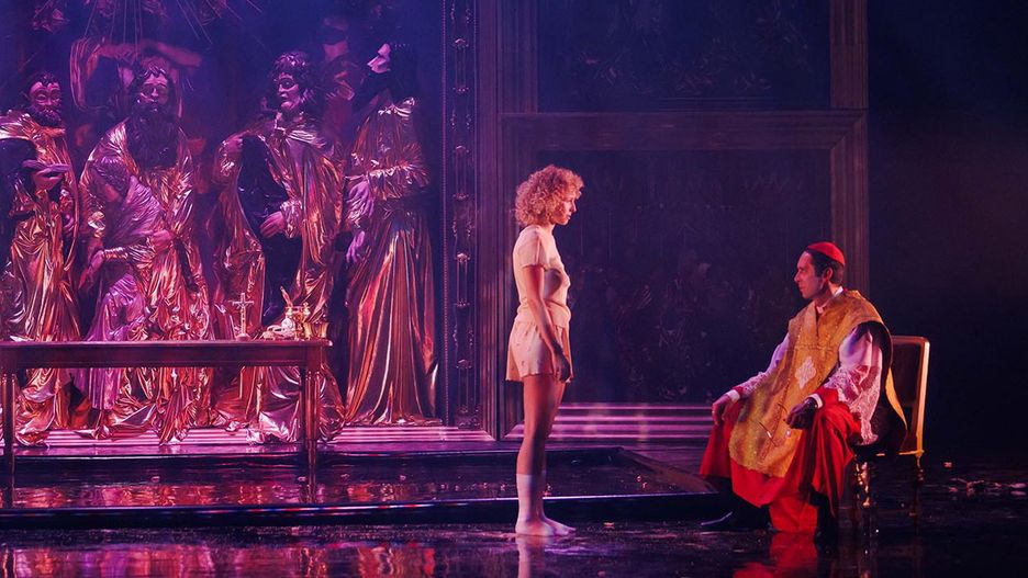 A zaraz zamiast pieśni w ruch idą pięści: na scenie zaczyna się regularny pogrom. Ktoś pałuje kogoś drzewcem z zaplamionym krwią narodowym sztandarem, ktoś bije i przegania geja, ktoś obcina Żydom pejsy, ktoś inny załatwia się do zerwanego z żydowskiej głowy kapelusza, kilku łysych osiłków z nacjonalistycznych bojówek grupowo gwałci dziewicę Zosię. Ci sami ludzie kilka scen później trafią na bal u Senatora i będą radośnie pląsać tak, jak władca im zagra. Ci sami ludzie słuchają kazań biskupa, który na ołtarzu - to swoją drogą jeden z najbardziej okazałych i spektakularnych elementów ociekającej złotem scenografii: kopia dzieła Wita Stwosza z Bazyliki Mariackiej - wygłasza płomienne patriotyczne słowa, obłapiając za sukienkę młodą dziewczynę.