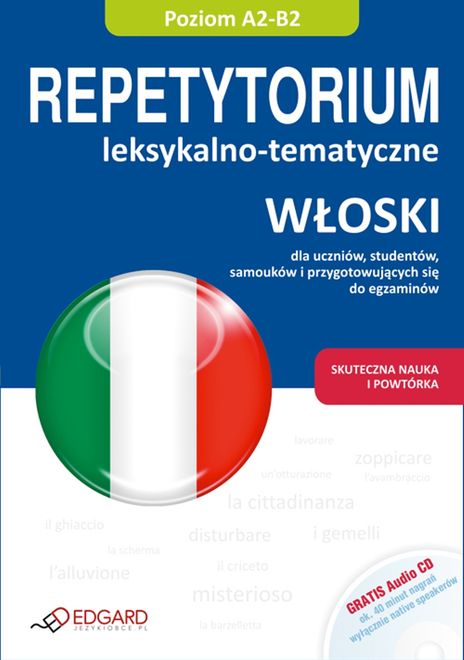 Włoski Repetytorium leksykalno-tematyczne - nauka 4000 słów, wyrażeń, kolokacji i idiomów, - 50 zagadnień uporządkowanych w 14 rozdziałach, - kilkadziesiąt interesujących tekstów pokazujących użycie słów w praktyce, - 170 różnorodnych ćwiczeń z kluczem odpowiedzi, - współczesne, aktualne słownictwo i potoczne zwroty, - specjalnie opracowane testy powtórkowe + minisłowniczki. Nowoczesne Repetytorium leksykalno-tematyczne umożliwia poznanie lub przypomnienie sobie 4000 słów, wyrażeń, kolokacji i idiomów na poziomie podstawowym i średnio zaawansowanym (A2-B2 wg klasyfikacji Rady Europy). Zestaw (książka + płyta CD Audio) adresowany jest do samouków oraz do wszystkich, którzy chcą poszerzyć zasób włoskiego słownictwa, przypomnieć sobie i skutecznie utrwalić znajomość zwrotów niezbędnych na co dzień. Opracowany został również z myślą o samoukach oraz tych, którzy chcą poszerzyć zasób współczesnego włoskiego słownictwa. Repetytorium może być pomocne nauczycielom - do wykorzystania podczas lekcji lub korepetycji. Podręcznik (224 str.) obejmuje 50 zagadnień uporządkowanych w 14 rozdziałach tematycznych. W każdym podrozdziale znajdują się: wprowadzenie do tematu, przykładowy tekst lub dialog, słownictwo podstawowe oraz dodatkowe wraz z tłumaczeniami, a także różnorodne ćwiczenia sprawdzające i utrwalające. 14 rozdziałów oraz kilkadziesiąt tekstów i dialogów obejmuje najważniejsze zagadnienia, opracowane zgodnie z wymaganiami obowiązującymi na nowej maturze. Samodzielne sprawdzenie wiedzy ułatwia 150 różnorodnych ćwiczeń, m.in. pytania typu prawda / fałsz, łączenie w pary, uzupełnianie luk w tekście. Na końcu podręcznika znajdują się specjalne testy powtórkowe oraz pełny klucz odpowiedzi. Płyta CD Audio jest doskonałym uzupełnieniem nauki z podręcznikiem. Obejmuje 40 min wysokiej jakości nagrań w wykonaniu rodowitego Włocha. Jest szczególnie pomocna w nauce prawidłowej wymowy oraz w ćwiczeniu umiejętności rozumienia ze słuchu.